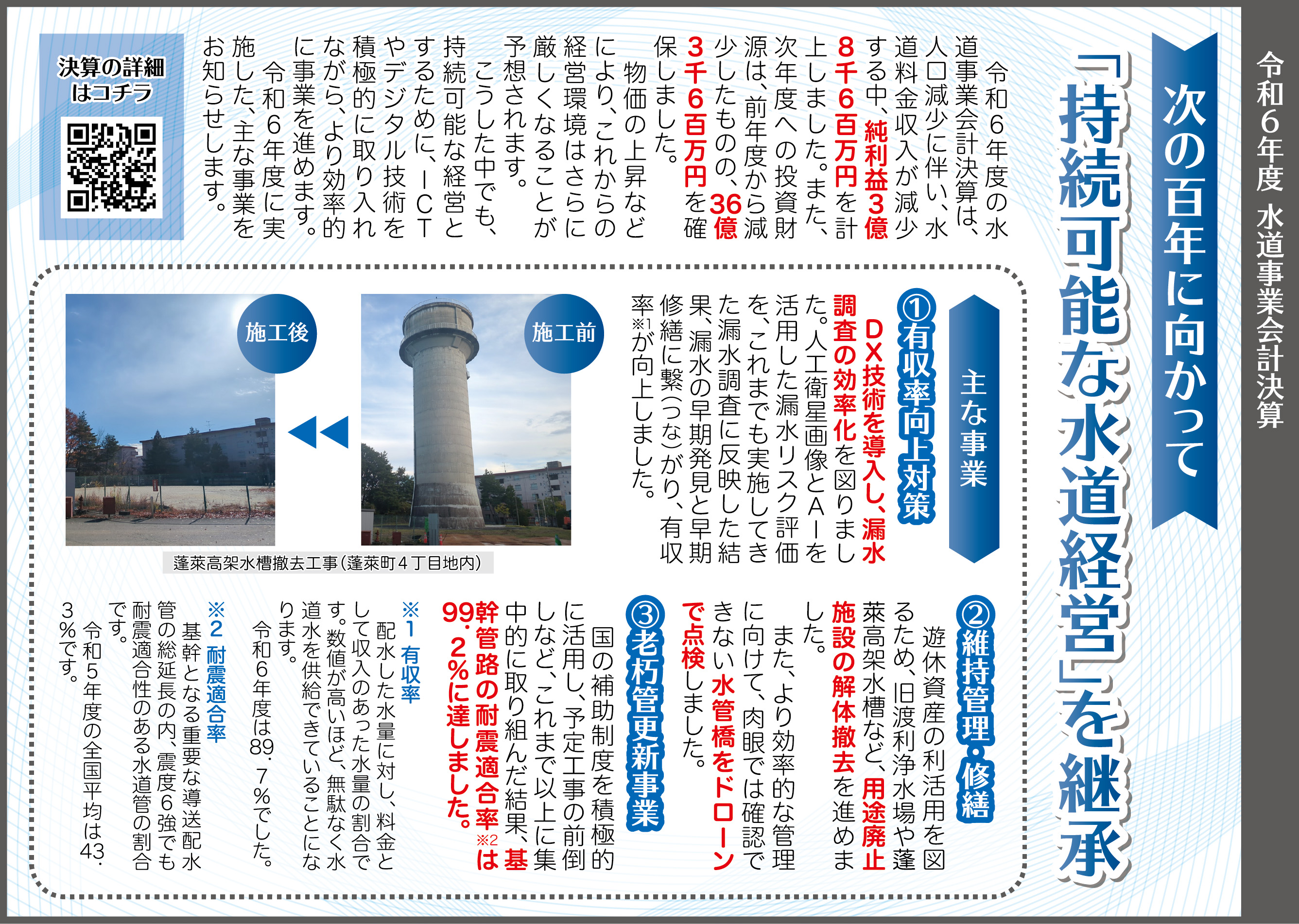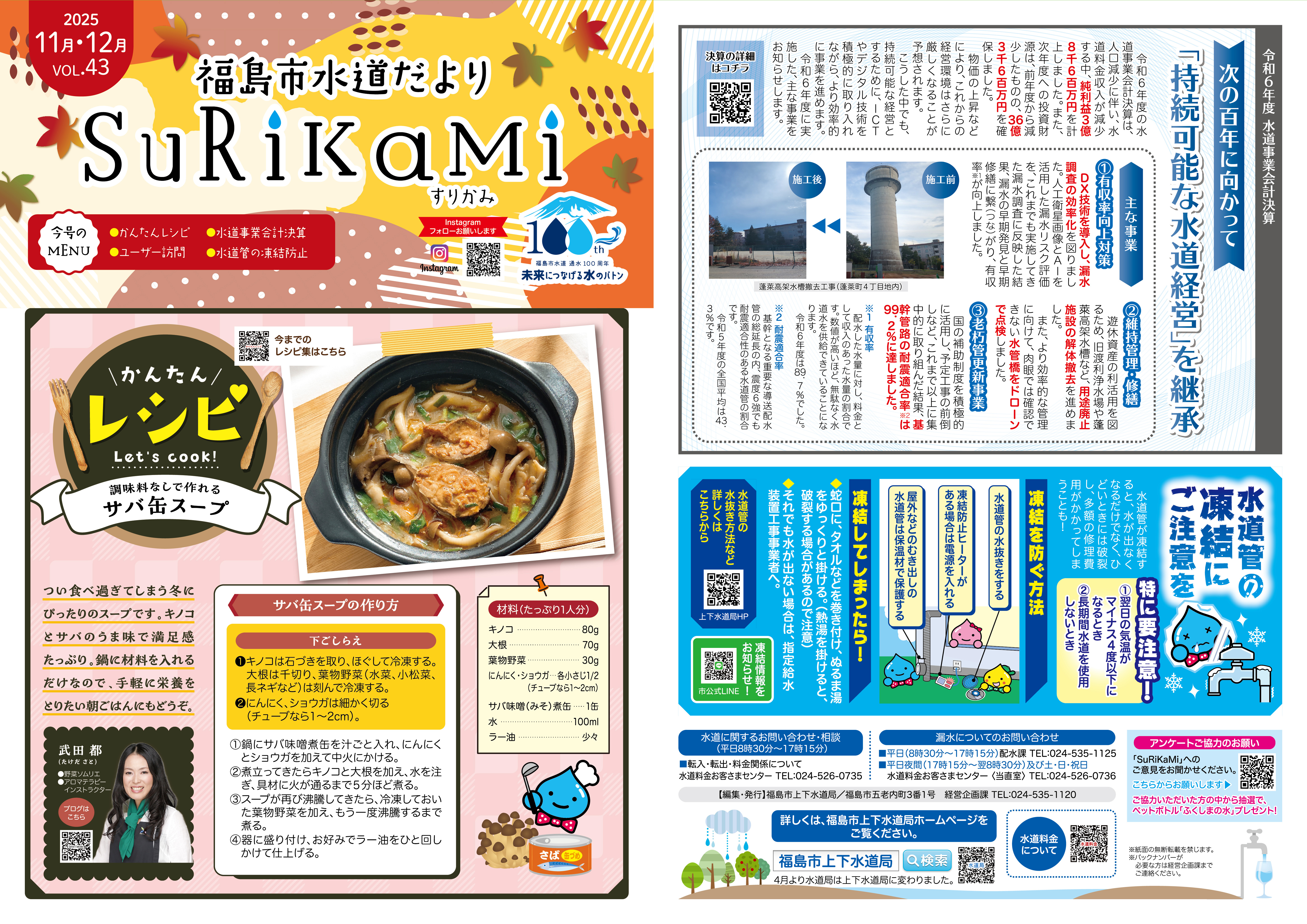 季節の話題などを盛り込み、年に4回発行、水道メーター検針時に配布しています。