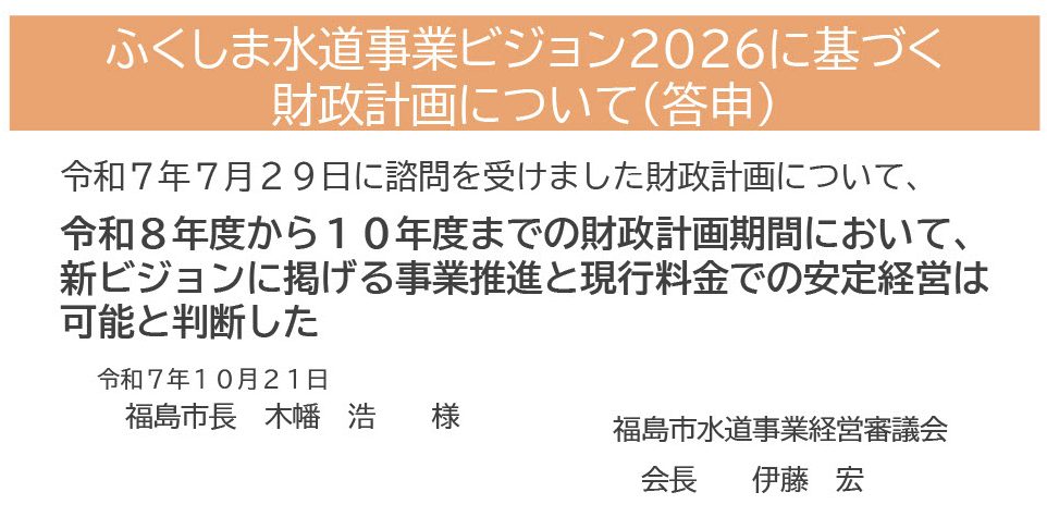 「ふくしま水道事業ビジョン2026(以下、新ビジョン)」に基づき財政計画が策定されていることから、新ビジョンのコンセプト、各種施策全般について審議した。あわせて、財政計画期間の3か年のみならず、R8年度からR17年度までの10年間の収支見通しについても審議の対象とした。水需要予測に基づく適正な収入見込みのもと、R8年度からR10年度までの財政計画期間においては、投資資金が確保されており、現行料金での運営は可能である。一方、人口減少に伴う水道料金の減収と現下の物価高騰が経営に与える影響は大きく、次の財政計画期間中となるR12年度からの投資資金不足に対しては、早急に対策を講じるべきと考える(別添付属資料「更新事業と年度末繰越財源の推移」)。持続可能な水道事業経営の視点から、以下、3つの要望を付すものである。